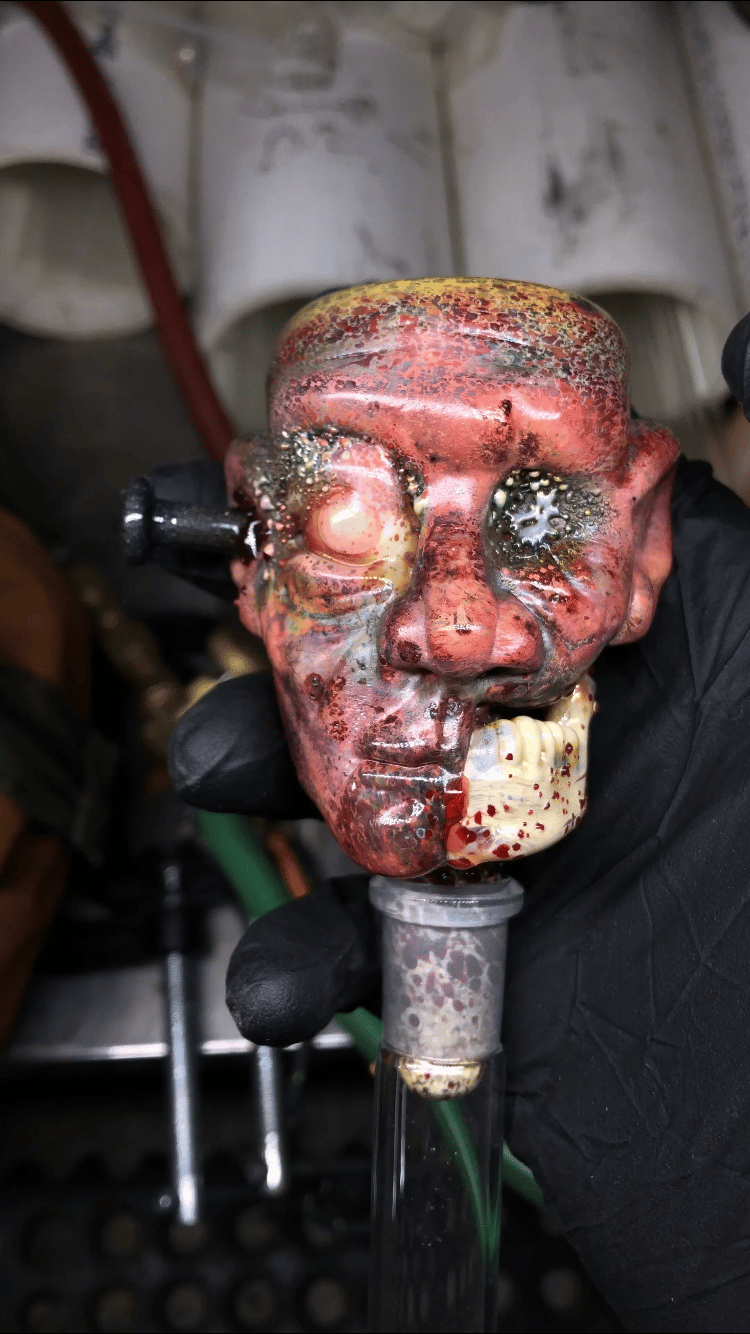 Is he dead yet? Or still alive. Both. His story is of survival. To die and come back stronger and hungrier than ever as an extreme function of nature. My favorite part is the action of a nail hammered into his ear that causes blood and pressure buildup in the eye he has left. An effort to stop the voices. It functions as a slide with a handmade 14mm joint.
